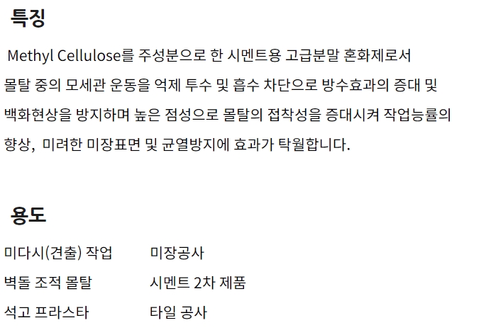 Methyl Cellulose를 주성분으로 한 시멘트/레미탈용 고급 분발 혼화제입니다.